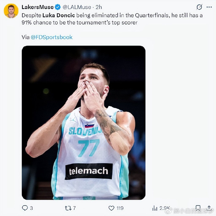 湖人媒体写道:虽然东契奇无缘半决赛、决赛,但根据数据媒体的预测,他依旧有91%的概率拿到本届欧洲杯的得分王。